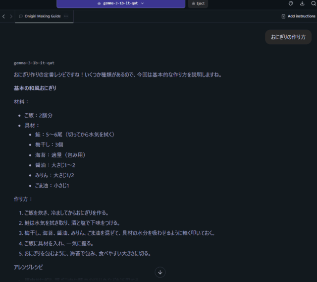 ちなみに、先日試してみた「gpt-oss-20B」は、少し古いゲーミングノート(Ryzen5 4600HS + GTX 1650)では、メモリが8GBしかなかったためか、動くとは言い難いレベルだったのですが、Gemma 3 270M はサクサク動いてくれました。32ビットの状態で4GBの「Gemma 3 1B」くらいであれば動くかもしれないんですけど、まだ試せてません。