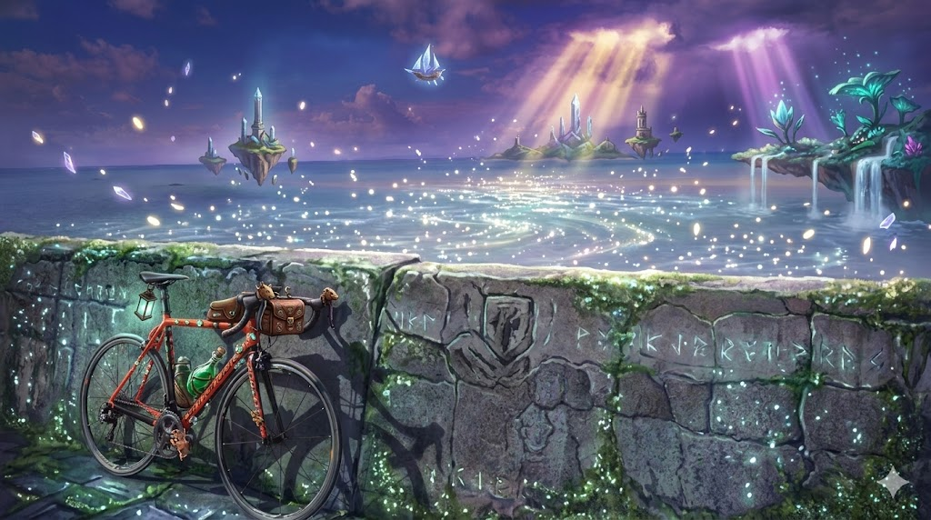 光の粒子が飛び、遠景が神話っぽくなり、石壁は紋章っぽくなる。